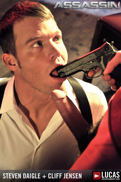 Rookie police detective Steven Daigle is casing the crime scene with boss Wilfried Knight. Steven is hot on the case of discovering who shot Junior Stellano but it’s a tough job and he needs a cocktail to help take the edge off. Bartender Cliff Jensen is happy to oblige, but it’s more than just a shot of liquor he winds up giving Steven. With his fly already down, Cliff hops over the counter, pours a drink over his hard cock and tells Steven to take a stiff drink. Steven does so without hesitation and takes Cliff’s smooth, cut cock all the way down his throat. While Steven gives him a wet blowjob, Cliff makes a grab for Steven’s gun to compare which is bigger. Rest assured — it’s Cliff’s. Soon after, Steven gets serviced himself… he peels off his cop clothes and hops up onto the counter where he aggressively pumps his dick down Cliff’s throat. They role-reverse again and Cliff lays on the counter spread eagle so Steven can give him a deep, slurping rim job. It doesn’t take either of them long to get ready for some fucking: Cliff turns Steven over on the counter, and starts pounding his smooth ass. Steven takes every inch of Cliff’s 8.5-inch cock, though he’s groaning and grabbing the counter during every, last second of it! Steven proceeds to jump onto his back so Cliff can drill him balls-deep until neither one of them can stand it anymore. The cop blows his load on Cliff’s leg and slurps up every last drop before falling to his knees and receiving Cliff’s cum all over his face.