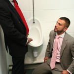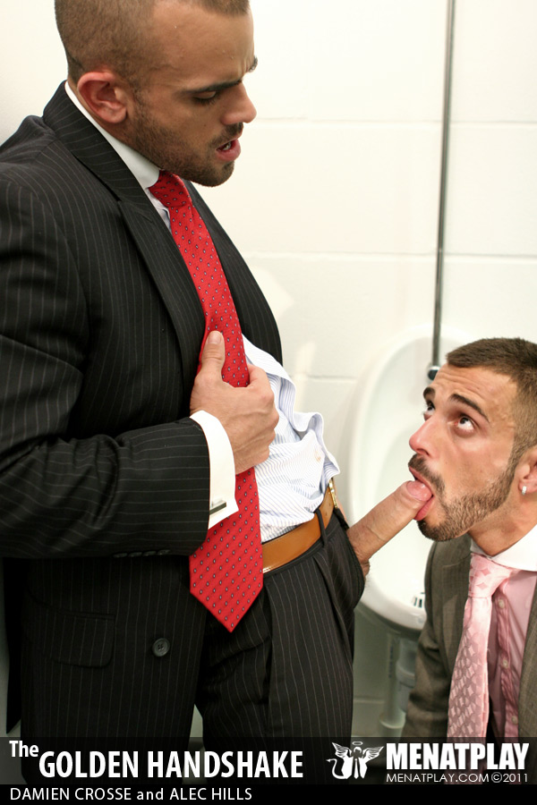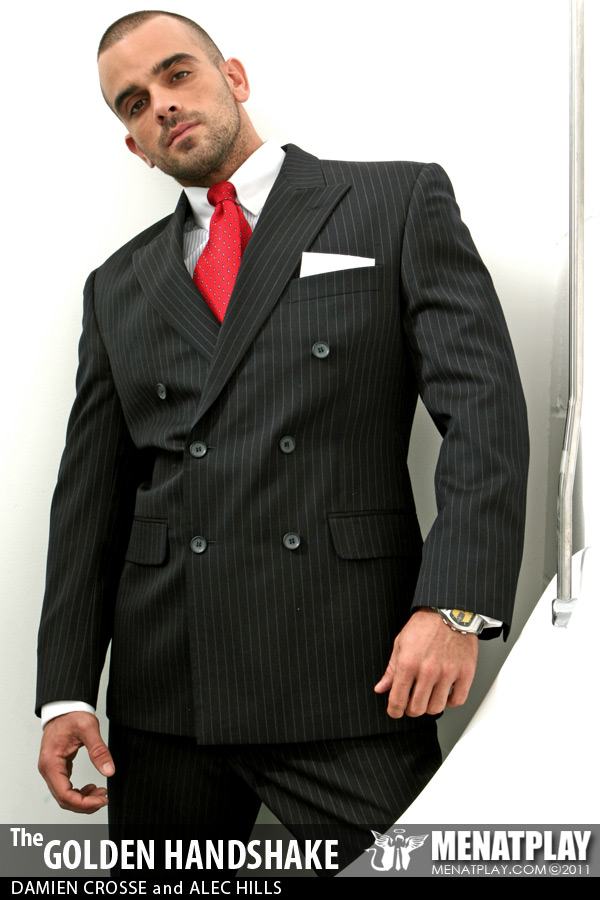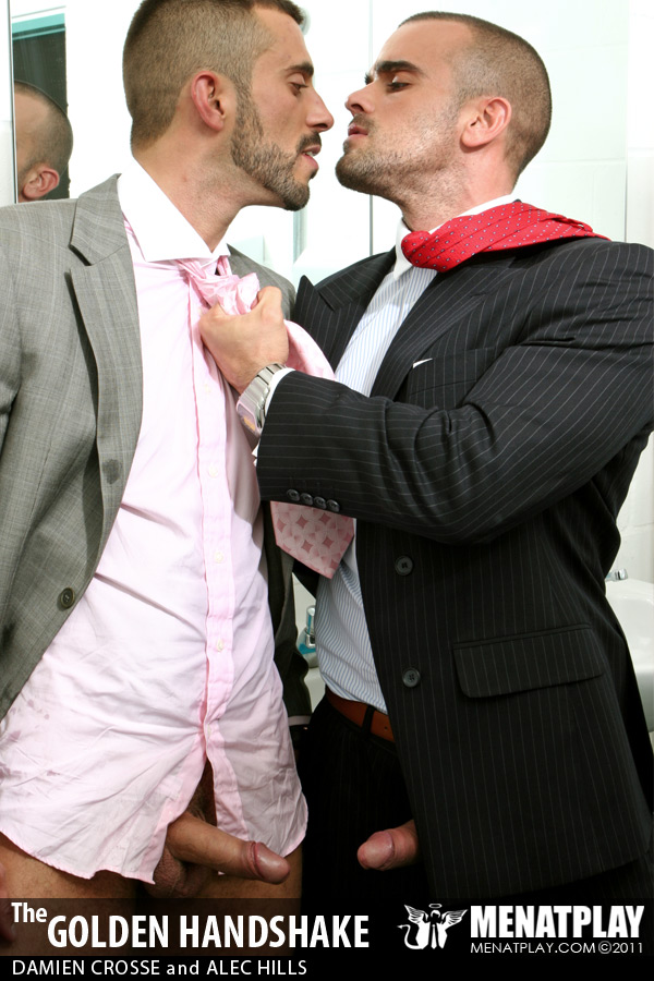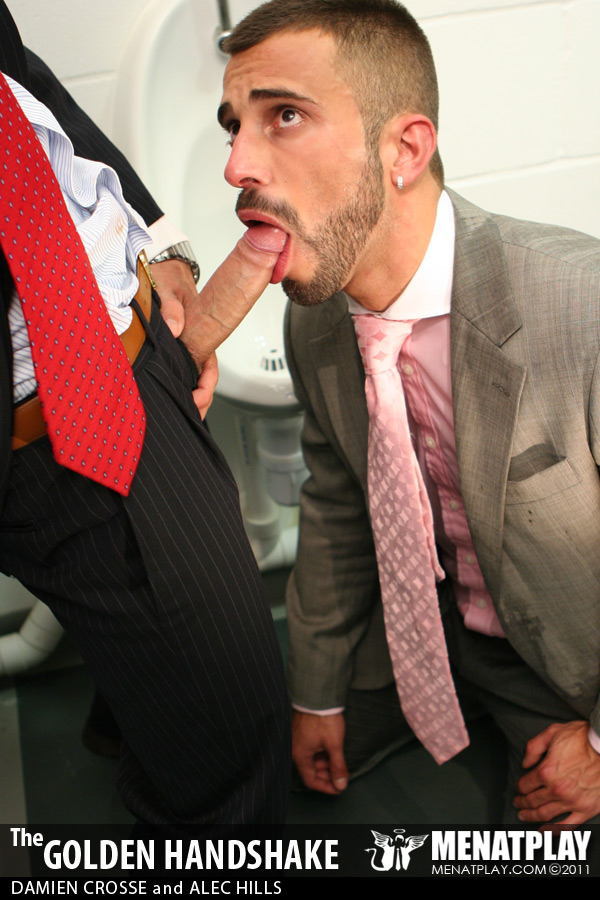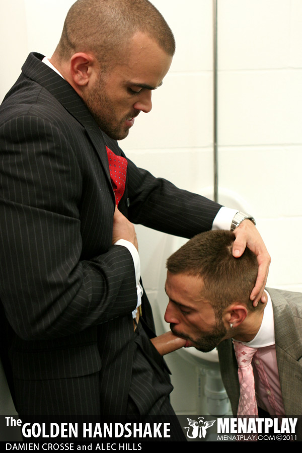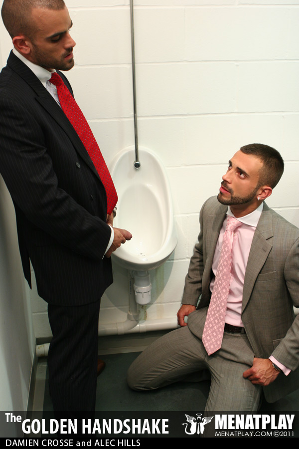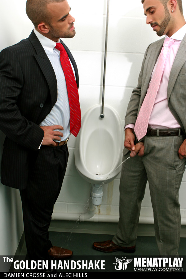 Menatplay revisit their filthy, kinkier side with their first watersports movie in over 6 years. Directed by Matt Jordan, Golden Handshake stars Damien Crosse as the arrogant boss who has just fired half his staff following a downturn in profits. But disgruntled employee Alec is not happy and when he comes across his boss in the mensroon his anger pushes his to take revenge on his boss by purposefully missing the urinal and pissing on his expensive designer shows. But clearly Damien is not about to stand back and take it lightly, instead he teaches Alec who’s boss, and pushes him to the floor to piss all over his suit, face and mouth, drenching him before giving him a hard pounding that he’s not likely to forget for the remainder of his time at the firm. Menatplay at its finest and dirtiest!