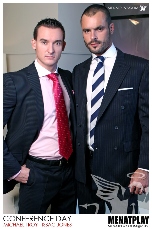Issac jones is back on Menatplay with the beefed up Michael Troy who he meets at a business conference. When Michael and Issac take a break away from the boring conference Michael spills some of the buffet down his very smart tie and its up to Issac to come to the rescue. What a great excuse to open up Mr.Troy’s shirt and play with that Beefy chest. These two have a great chemistry and both are so handsome. And knowing that Michael Troy is straight, (yes not just in the story line), makes it even more horny that he’s the one that takes a good arse pounding from Issac. So next time your bored, throw your dinner down yourself, you might be lucky enough to end up being helped out by someone as sexy as Issac.